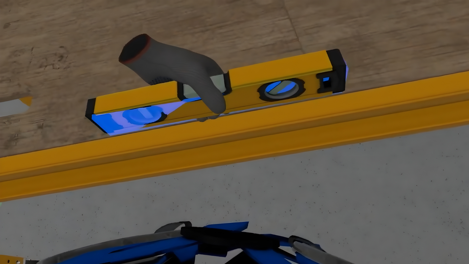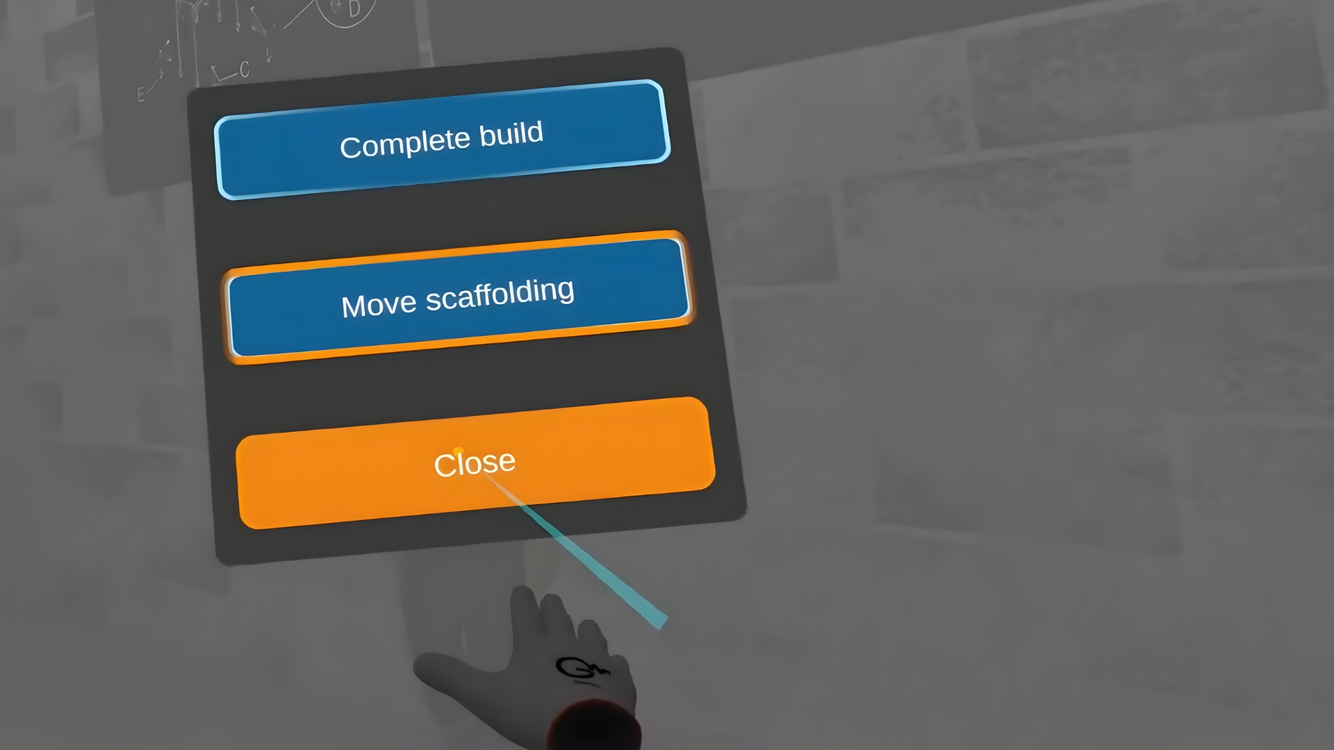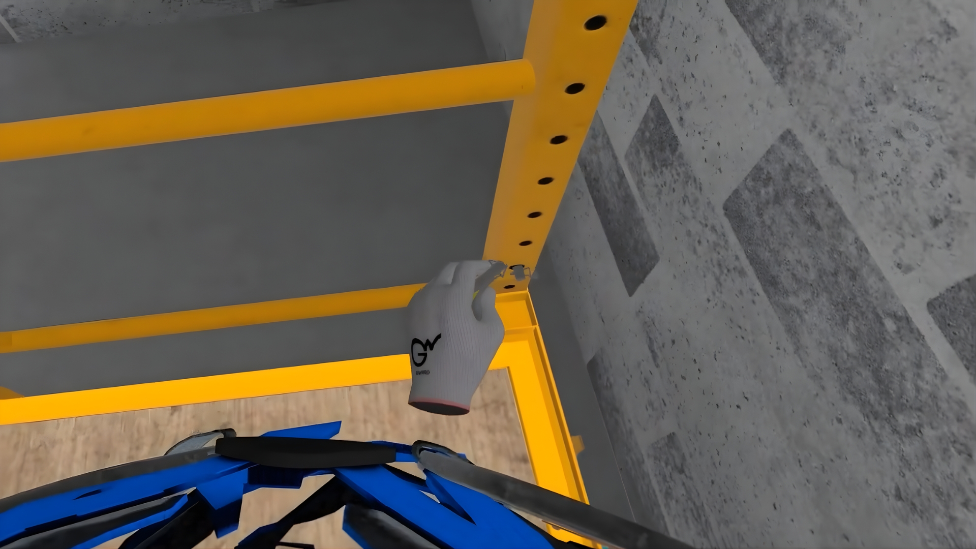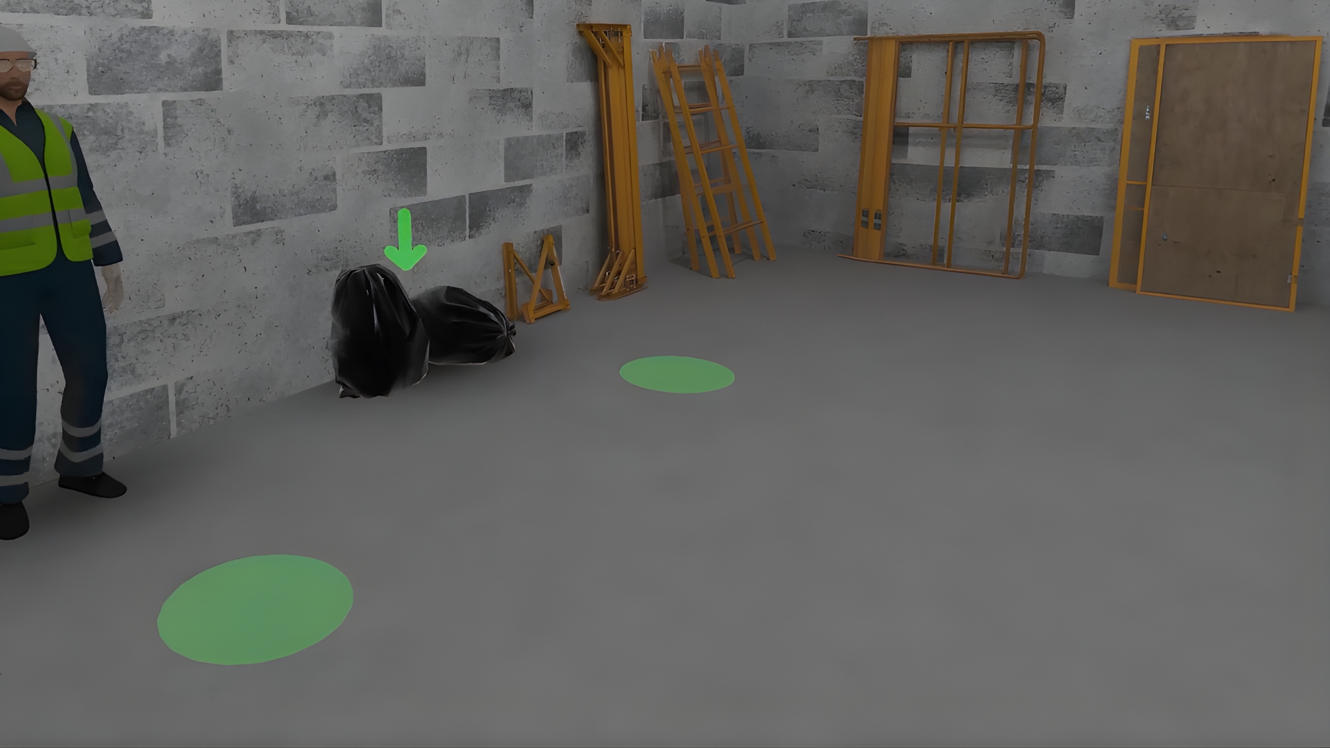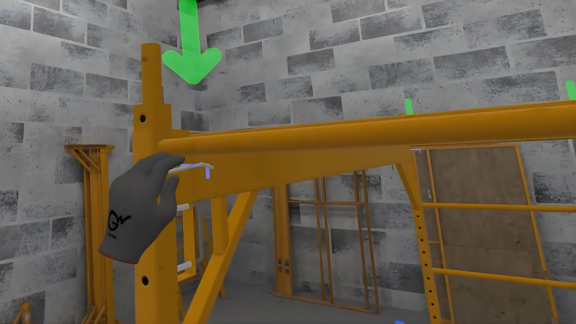 The second member of the team will assist with the task. The simulator begins by cleaning the job site and gathering and placing the necessary parts. Then the user learns to build the scaffolding levels and verticals step by step, checking the correctness of the construction.