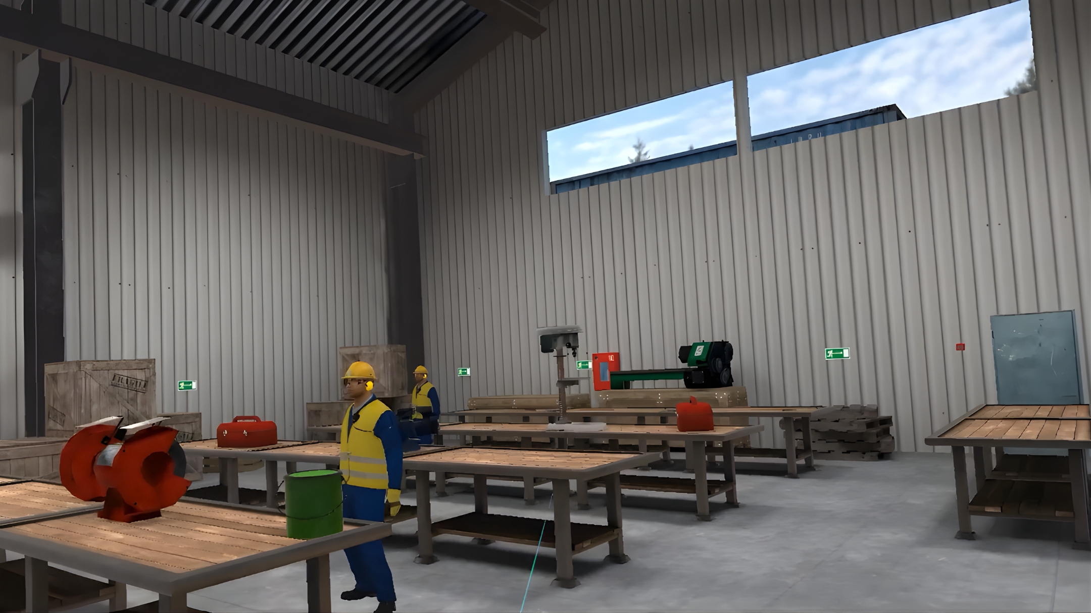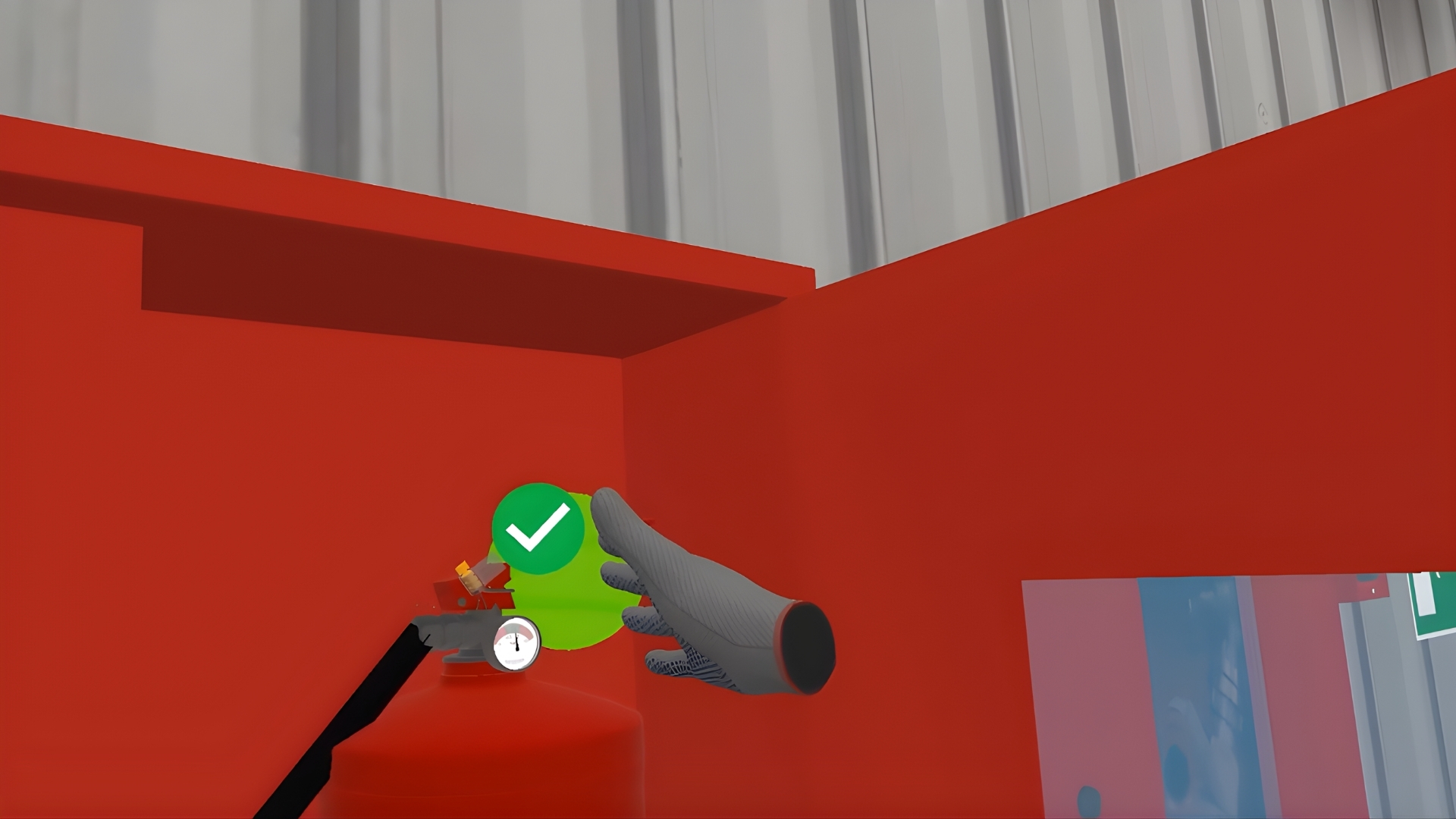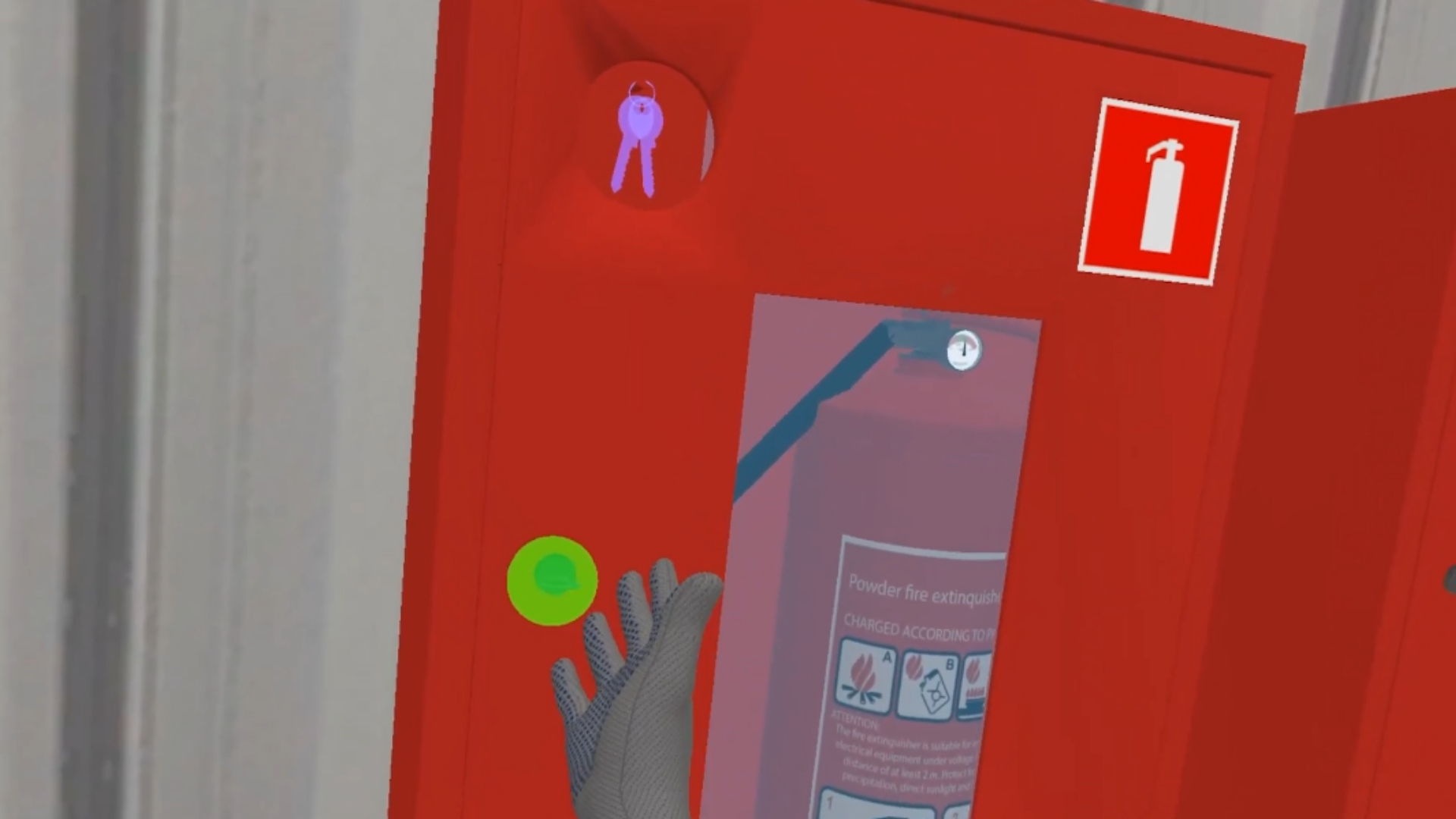 In the VR simulator you will go through all the fire-preventing measures and study them: evacuation plan, fire-exits, fire-alarm buttons, fire extinguisher.