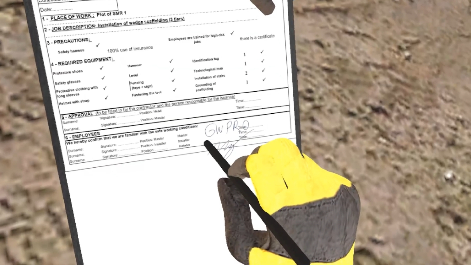 The user will start from showing his access documents to the supervisor. After that the user will put on PPE and check all the tools for any damage possible. Our VR training provides random damages on the equipment that makes training unique.