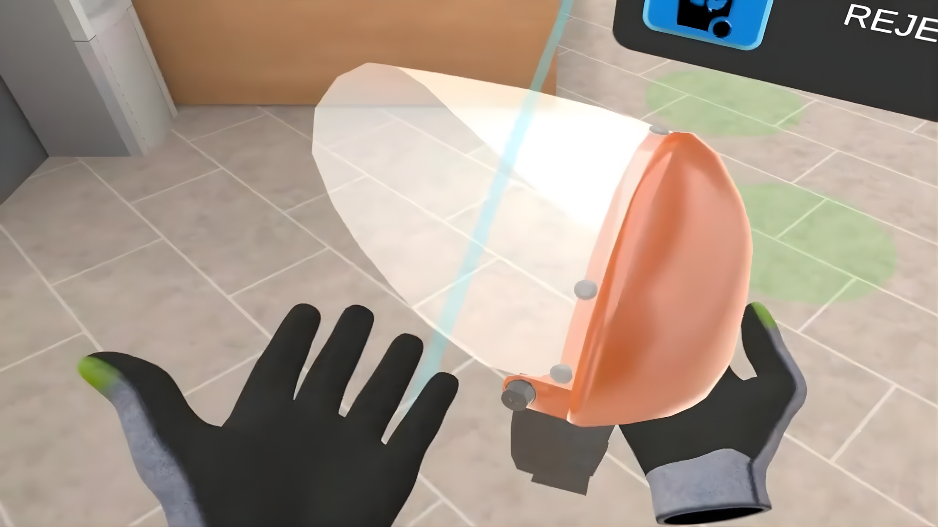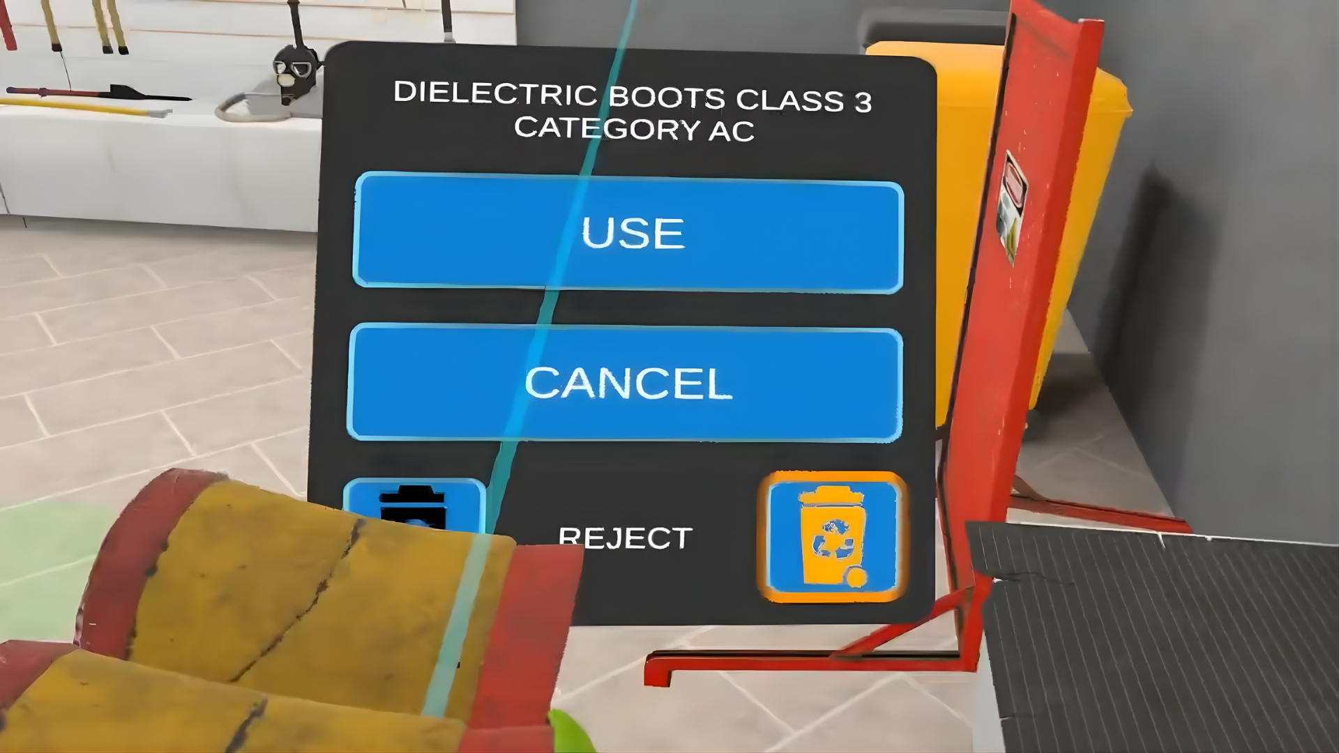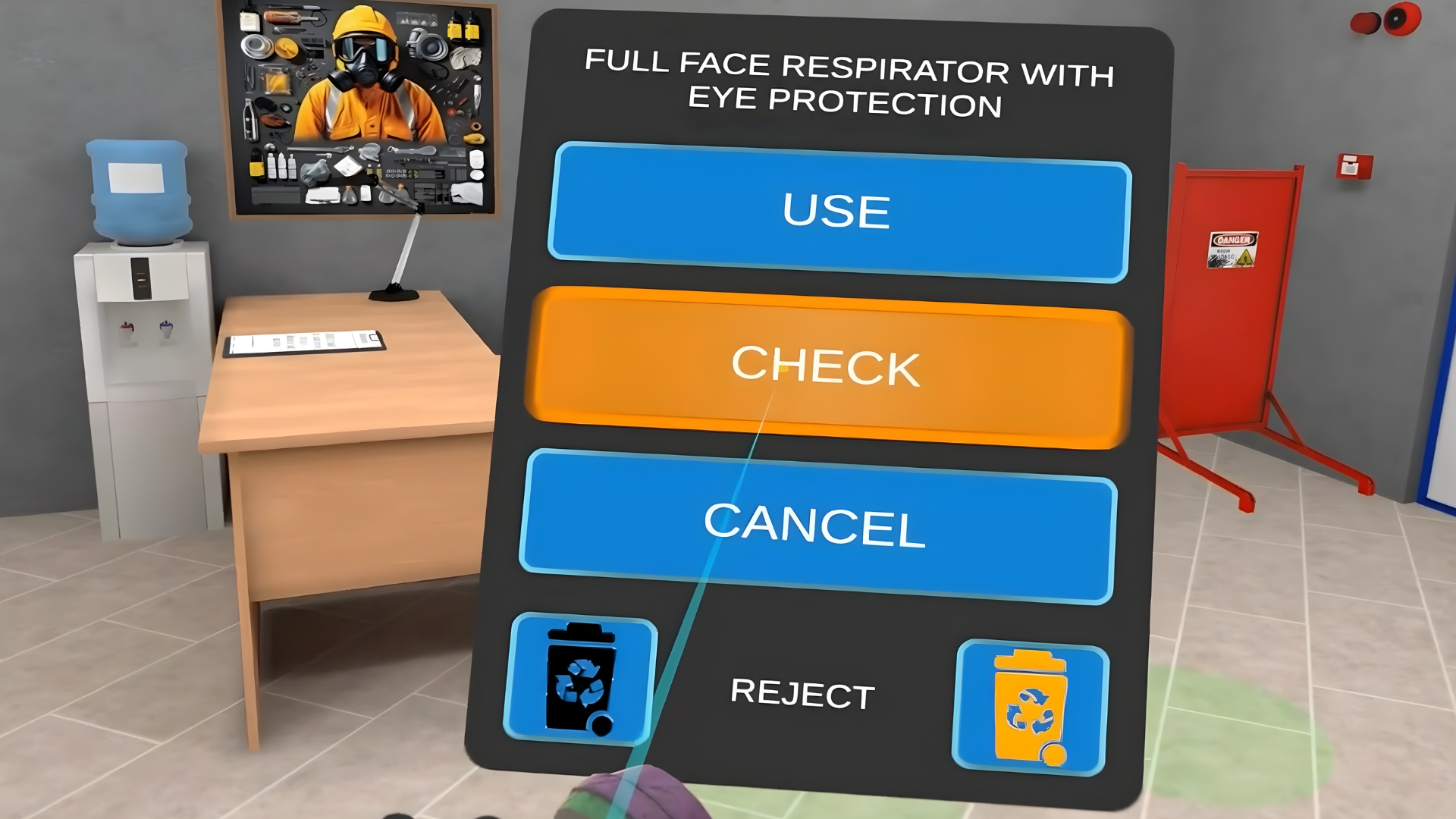 The VR Training includes checking basic PPEs, declining the damaged ones, understanding of the checking process, dividing the PPEs into the ones that you are wearing now and the ones that you should bring to your workplace.