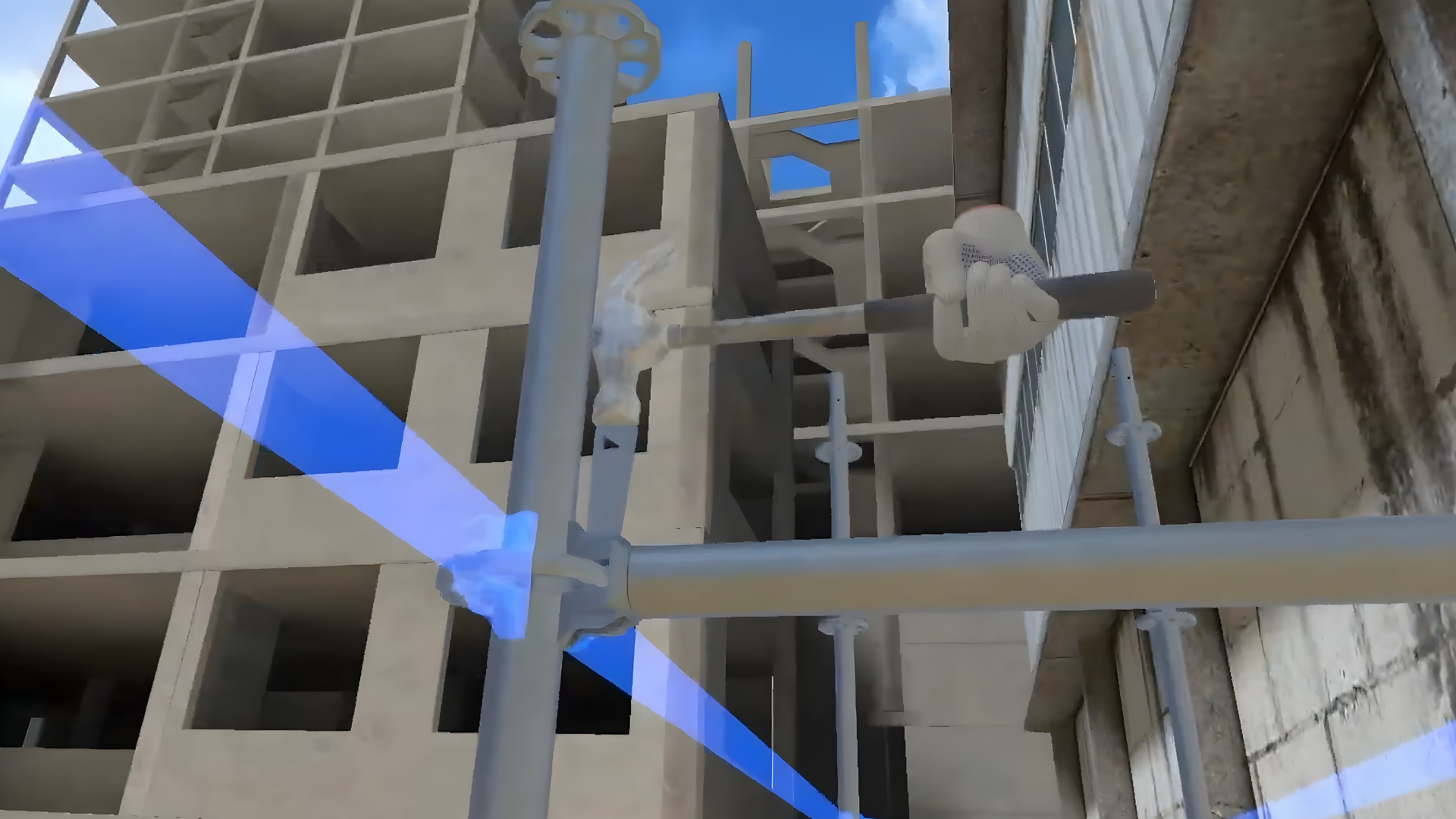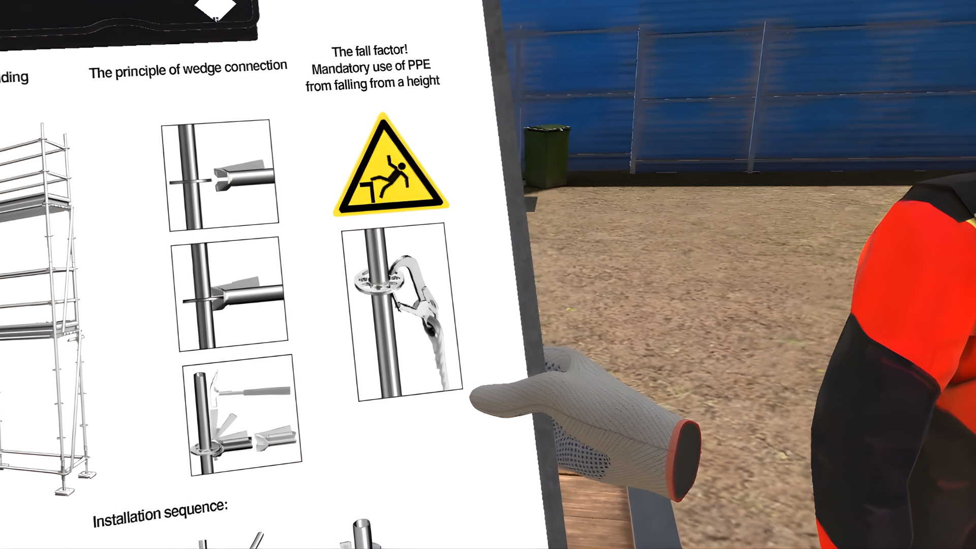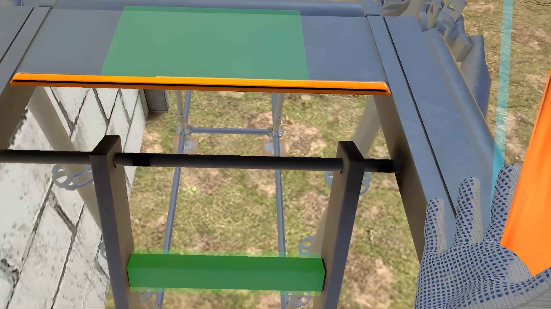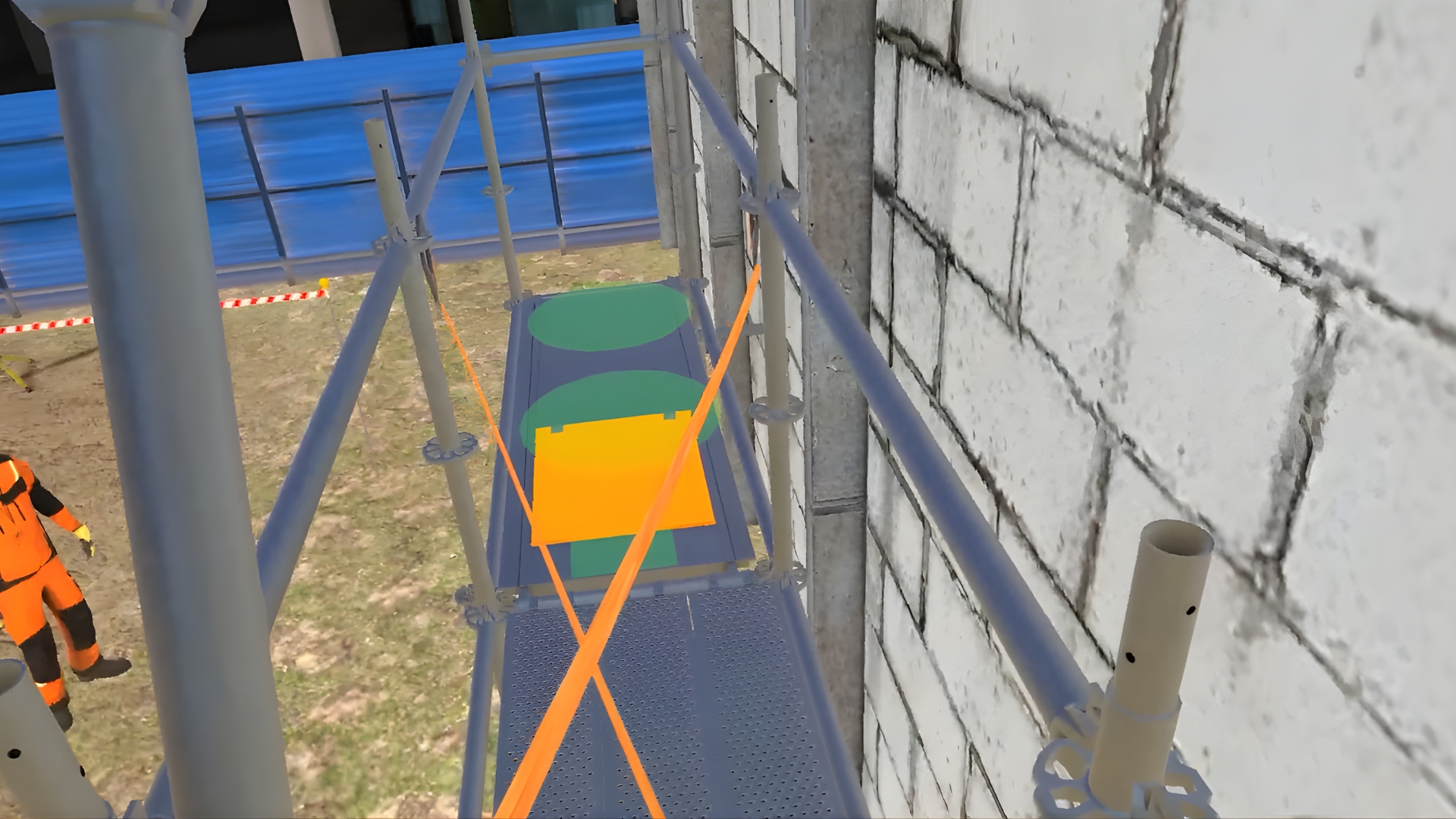 In the VR simulator, the user will prepare the site, tools, construct three levels of the wedge scaffolding, control the horizontal level of the scaffolding parts, and mark the scaffolding as ready for use. The second member of the team will help with the task.